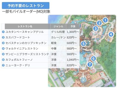 | 1.カフェポルトフィーノ | メディレーニアンハーバー | 不要 | 洋食(パスタ/ロティサリーチキン) | 〇 | 約570席 | バフェテリア | 1,200~2,200円 | 〇 |